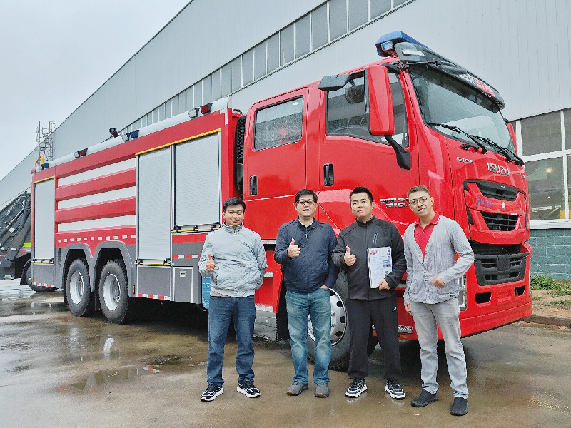 Caminhão de bombeiros ISUZU GIGA fazendo serviço pós-vendaPaíses orientais Filipinas, Laos, Camboja, Mianmar etc. clientes visitando para inspeção e aprendendo a operação do caminhão de bombeiros ISUZU.