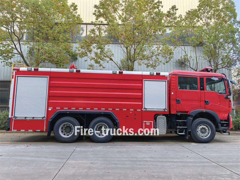 O caminhão de bombeiros Howo TX460 6x4 de 12 m³ com espuma adota uma cabine Sinotruk TX 6x4, com distância entre eixos de 4600 + 1400 mm, e está equipado com um motor SINOTRUK MC11.46-61 e uma caixa de câmbio HW19710. A parte frontal da superestrutura abriga um compartimento para armazenar diversos equipamentos de combate a incêndio, enquanto a seção central contém um tanque de água de aço carbono de 9 metros cúbicos e um tanque de espuma de 3 metros cúbicos. A seção traseira abriga a sala de bombas, equipada com uma bomba de incêndio CB10/60-RS, um painel de controle e alguns equipamentos auxiliares de combate a incêndio. Os tanques de água e espuma no teto possuem bocas de visita, e um canhão monitor de incêndio PL8/48 também está incluído.