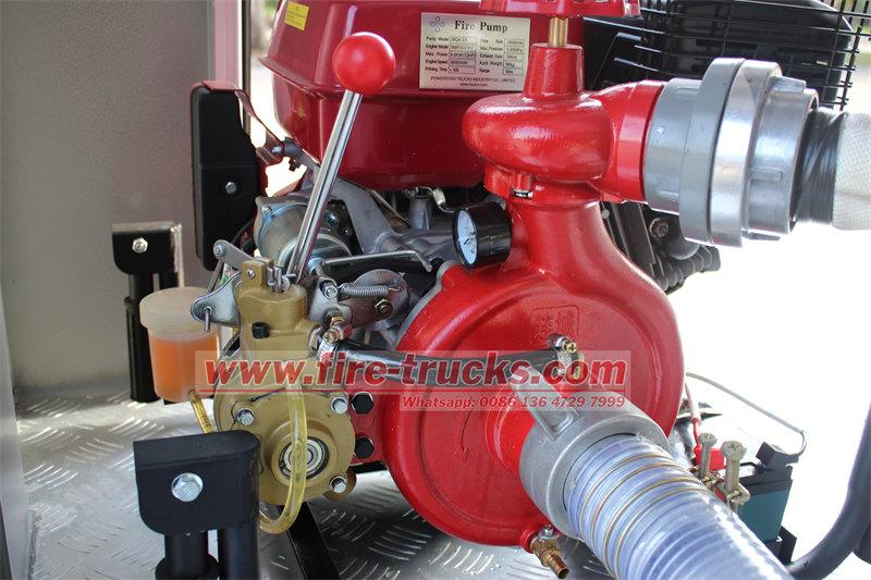 O sistema de bomba de incêndio utiliza uma bomba de incêndio portátil JBQ4.5/9 com vazão de 600 l/min e pressão máxima superior a 0,65 MPa, capaz de fornecer grandes volumes de agente supressor de incêndio em um curto espaço de tempo. O monitor de incêndio PS20 possui vazão nominal de 20 l/s e alcance de mais de 50 metros, com rotação horizontal de 360° e ajuste vertical de -15° a 60°, permitindo o controle preciso da direção e do ângulo da pulverização.