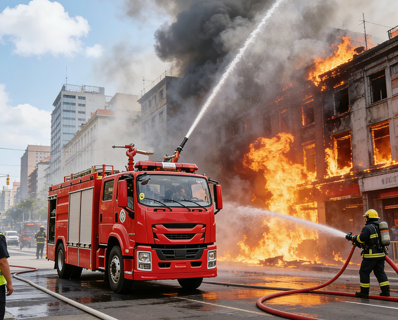 O caminhão de bombeiros Isuzu 4X GIGA, equipado com pó químico seco, é um veículo especializado projetado para combate a incêndios e resgate de emergência, integrando funções de abastecimento de água, extinção de incêndios e socorro em desastres.