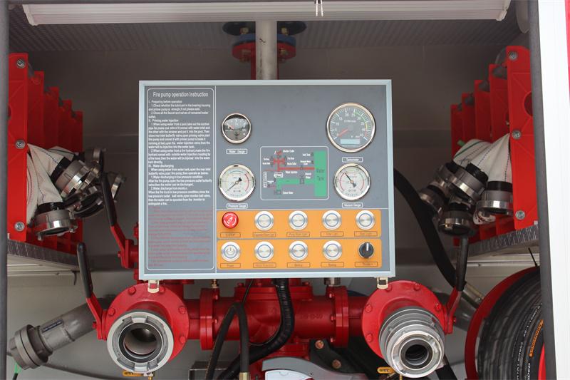 Painel de controle: Localizada na sala de bombas, a central integra indicadores de nível de água, pressão, vácuo, tacômetro, freio de emergência, luzes da sala de equipamentos e da sala de bombas, luzes laterais, luz traseira, interruptor de escorva, interruptor geral, acelerador eletrônico e outros botões; instruções de operação da bomba de incêndio, diagrama da tubulação do tanque de água, etc. A interface é intuitiva, facilitando o monitoramento e a operação em tempo real dos botões relevantes pelos bombeiros.