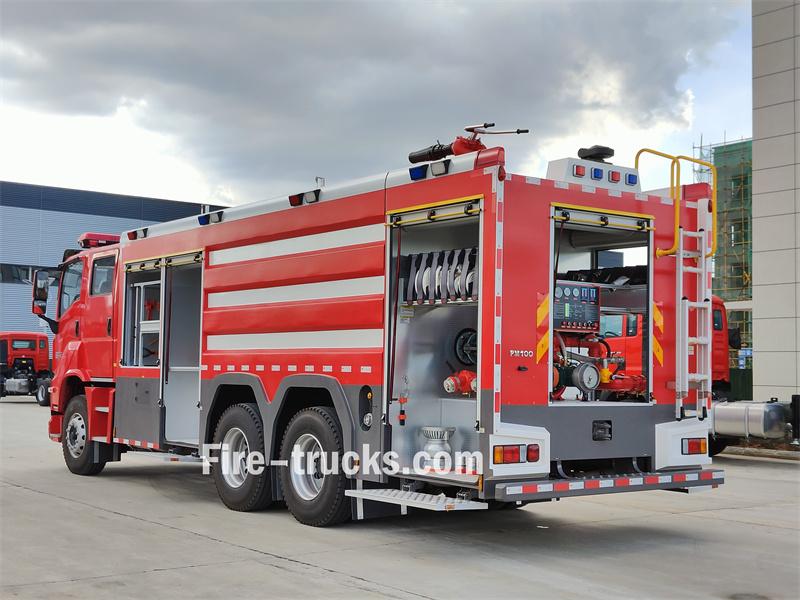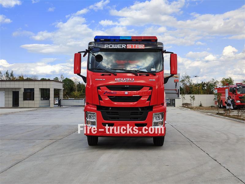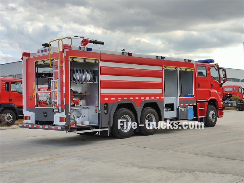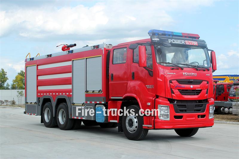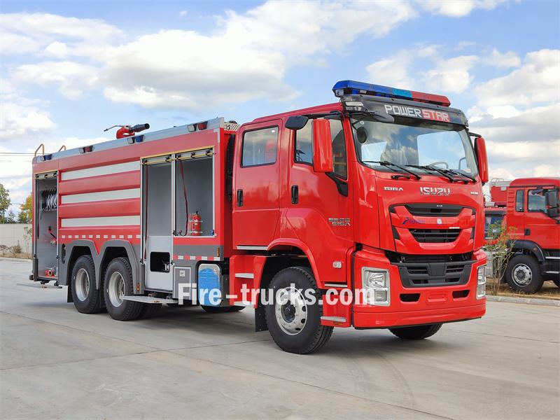 O caminhão de bombeiros Isuzu GIGA 6X4 de 10 metros cúbicos para espuma é baseado no chassi do Isuzu GIGA 6X4, com uma distância entre eixos de 4600 mm + 1370 mm. É equipado com um motor Isuzu 6UZ1-TCG61 e uma transmissão Fast de 12 velocidades. A parte frontal da superestrutura abriga o compartimento de equipamentos, a seção central contém um tanque de água de aço carbono de 8500 litros e um tanque de espuma de aço inoxidável de 1500 litros, e a parte traseira é a sala de bombas, equipada com uma bomba de incêndio CB10/60-XZ, painel de controle, mangueiras de incêndio, equipamentos de combate a incêndio, etc. Um canhão monitor de incêndio PL8/48 está localizado no teto.